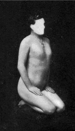 3. A primeira posição: (O Deus). Sente-se em uma cadeira; a cabeça erguida, as costas retas, os joelhos juntos, as mãos nos joelhos, os olhos fechados.