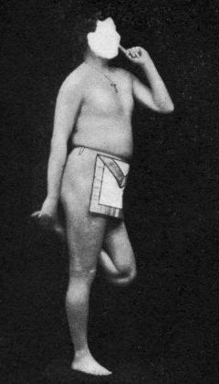 5. A terceira posição: (O Íbis). Fique de pé; segure o tornozelo esquerdo com a mão direita (e alternativamente pratique com o tornozelo direito na mão esquerda, etc.), o dedo indicador livre sobre os lábios.