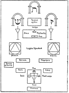 Então o Zelator é instruído quanto ao sinal, aperto de mão, grande palavra etc. Após isso, o Hegemon se levanta e conduz o Zelator ao Hiereus, que lhe explica o diagrama da “Forma Duplicada das Sephiroth Alquímicas”[5]. O Hegemon então lhe explica “As figuras geométricas lineares atribuídas aos planetas”[6]; e o Kerux “As dezesseis figuras da Geomancia”[7]. O Hierofante parabeniza o recém-iniciado Theoricus, e lhe confere o título de PORAIOS (ou PORAIA) DE REJECTIS, que tem o significado de “trazido de entre os rejeitados” e lhe dá o símbolo de Ruach, que é Ar em hebraico.