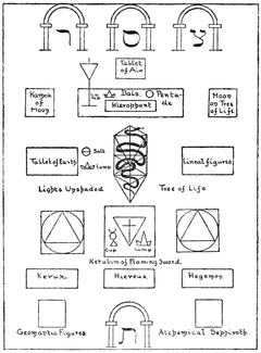 Então o Hierofante diz: “Os símbolos diante de você representam igualmente o Jardim do Éden[4] e o Santo dos Santos: Diante de você está a Árvore da Vida formada pelas Sephiroth e seus caminhos conectores. … Há vinte e dois caminhos conectores, e são distinguidos pelas vinte e duas letras do alfabeto hebraico, formando com as próprias dez Sephiroth os trinta e dois caminhos da Sabedoria do Sepher Yetzirah”. As letras, ele então observa, formam o símbolo da Serpente da Sabedoria, e as Sephiroth a Espada Flamejante. “Os dois pilares direito e esquerdo da Árvore são os símbolos do ativo e do passivo, masculino e feminino – Adão e Eva. … Os pilares representam ainda os dois Querubins da Arca; o da direita, macho – Metatron; e o da esquerda, feminino – Sandalphon. Acima deles sempre ardem as lamparinas de sua Essência Espiritual, a Vida Superior, da qual eles são os participantes no Eterno Incriado”.