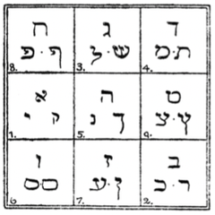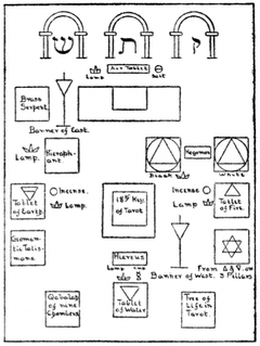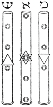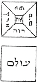 “Esta pirâmide é atribuída aos quatro elementos; em seu ápice está a palavra את (Ath) composta pela primeira e última letras do Alfabeto, significa Essência. A base quadrada representa o universo material”.