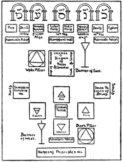 Então o Adepto Associado explica ao Philosophus a insígnia de admissão, que é o emblema peculiar do Hiereus de um Templo da Primeira Ordem. E o Hierofante Indutor explica o Lāmen do Hierofante e o Estandarte do Oriente, completando assim seu conhecimento dos Emblemas apropriados aos Oficiais de um Templo da Primeira Ordem.